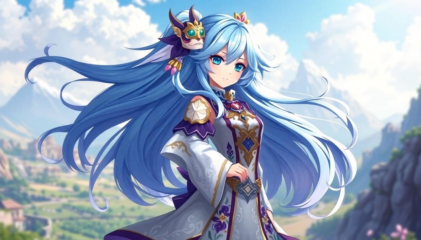Columbina sports a striking color palette, predominantly featuring blues and whites, which evokes a sense of calmness. Her outfit, adorned with elaborate patterns, showcases her connection to the Fatui. Long, flowing hair complements her ethereal look, creating a sense of motion. Unique accessories, including a playful mask, emphasize her enigmatic personality. The delicate yet bold design elements express her role as both a performer and a combatant, making her stand out among other characters.